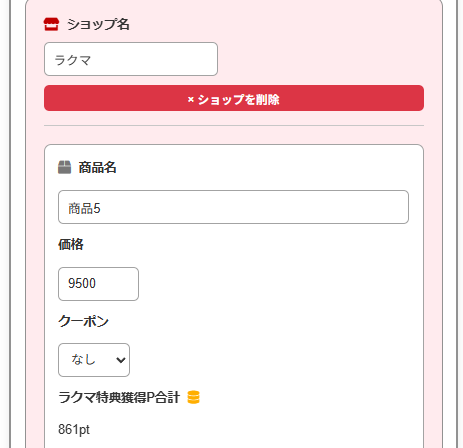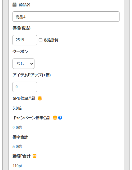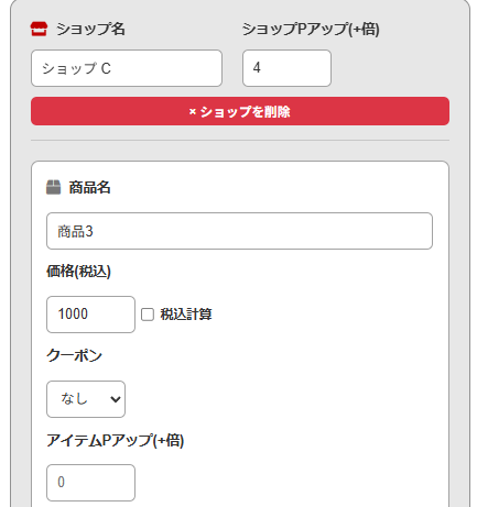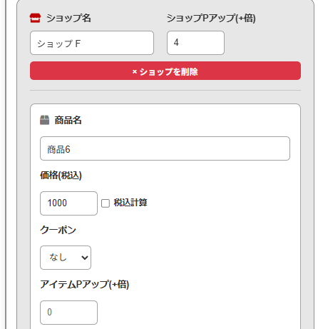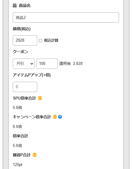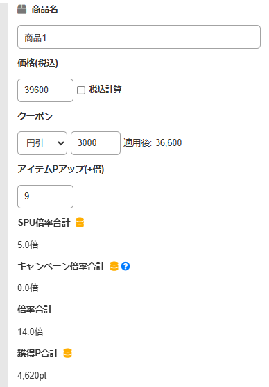 1店舗目の入力です。 税込価格と、利用したクーポンの割引額を入力します。この商品はアイテム個別のポイントアップもあったので、その倍率も反映させます。